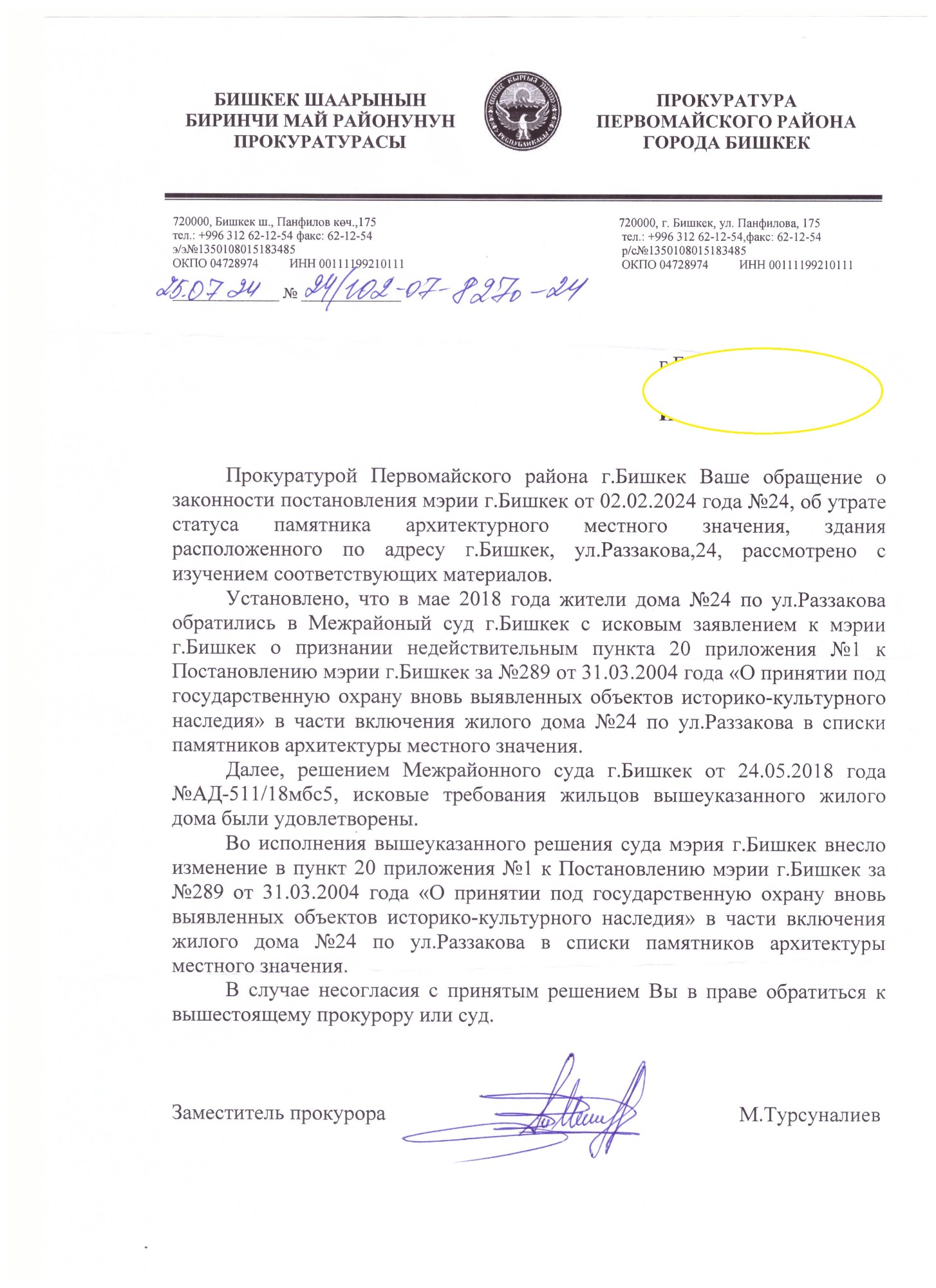 Искандер Бурканов предоставил копию ответа из прокуратуры, подтверждающую законность текущих действий владельца с точки зрения градостроительных норм. Кроме того, по этому поводу он также обращался в ГКНБ, где также ответили, что есть решение суда и они ничем помочь не могут.