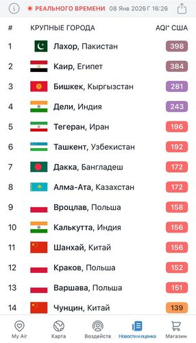 Сегодня антирейтинг возглавляет Лахор (Пакистан) с показателем AQI 398 (опасно для жизни). На втором месте Каир (Египет) — AQI 384.