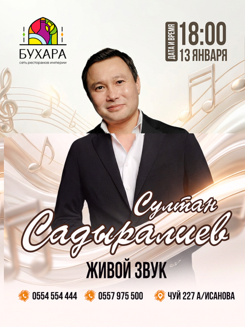 Этот вечер обещает стать по-настоящему незабываемым — живой звук, искренние эмоции и магия музыки в исполнении Султана Садыралиева. Ваши любимые хиты и новые песни, наполненные чувствами и душой.
