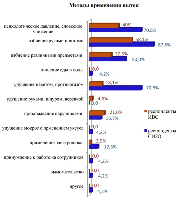 По его данным, 58,3 процента респондентов подверглись пыткам во время вывода за пределы СИЗО, а 41,7 процента - в период содержания в изоляторах временного содержания.