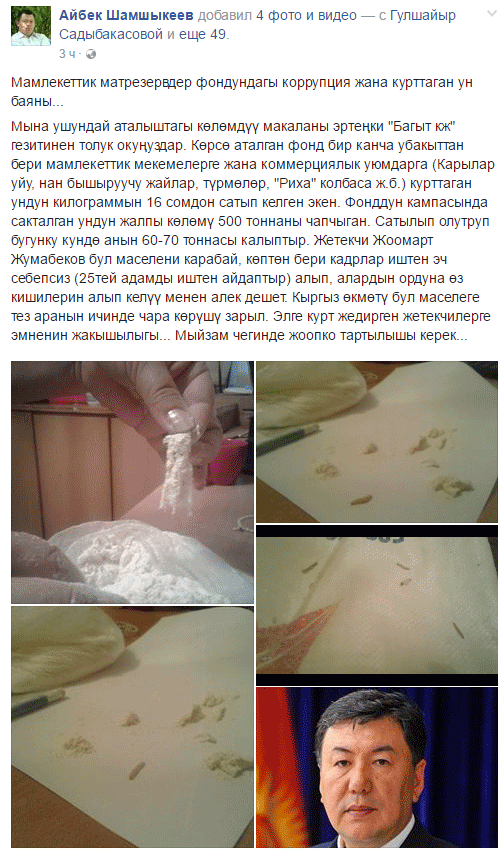 «В столице Кыргызстана реализуется испорченная и зараженная мука из запасов Фонда госматрезервов» - такое сообщение распространил сегодня на своей странице в Фейсбуке журналист Айбек Шамшыкеев.