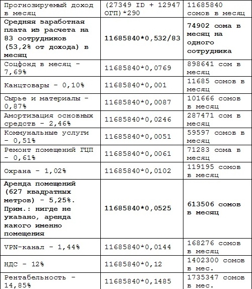 Мое внимание привлекает средняя заработная плата сотрудника ГП «Инфоком», задействованного в технологическом процессе. По расчетам она составила почти 75 тысяч сомов в месяц. Страшно представить, сколько тогда зарабатывает руководящий состав госпредприятия. А статья «Аренда помещений», честно говоря, ввела в ступор. Исходя из расчетов на эту статью расходов ежемесячно списывается 613 тысяч 506 сомов. Только вот кто же арендодатель?