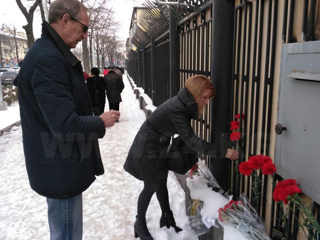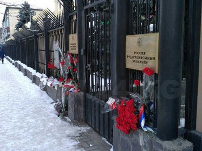 В столице Кыргызстана горожане в связи с крушением над Черным морем самолета ТУ-154, в результате которого погибли 92 человека, приносят цветы к посольству Российской Федерации, зажигают свечи.