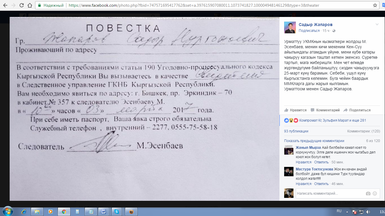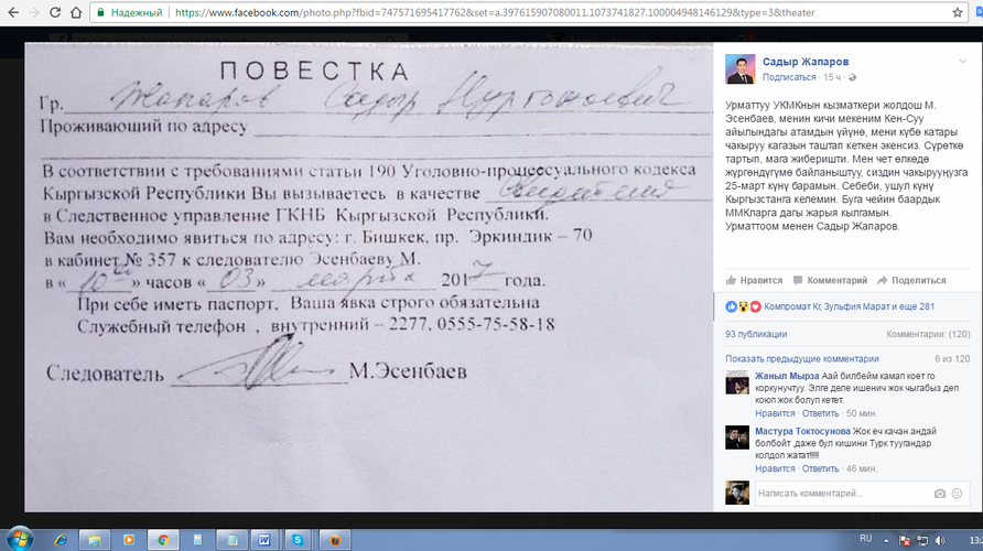 «Уважаемый следователь ГКНБ М.Эсенбаев, вы прислали повестку в мой отчий дом в селе Кен-Суу, в которой приглашаете меня в качестве свидетеля. Мне выслали ее фото. В связи с тем, что я нахожусь за рубежом, приду на допрос 25 марта, потому что в этот день я приеду в Кыргызстан. И заранее оповещу СМИ об этом», — написал Садыр Жапаров.