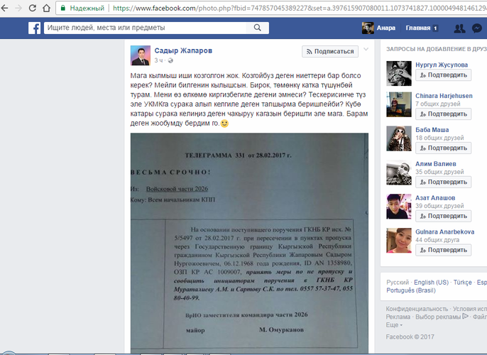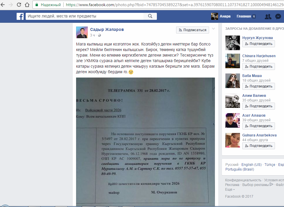 «На основании поступившего поручения ГКНБ КР исх.№ 5/5497 от 28.02.2017 при пересечении в пунктах пропуска через государственную границу КР гражданином Жапаровым Садыром Нургожоевичем, 06.12.1968 года рождения ID AN 1358980 ОЗП КР АС 1009007, принять меры по непропуску и сообщить инициаторам поручения в ГКНБ КР Мураталиеву А.М и Сартову С.К.», — говорится в документе.