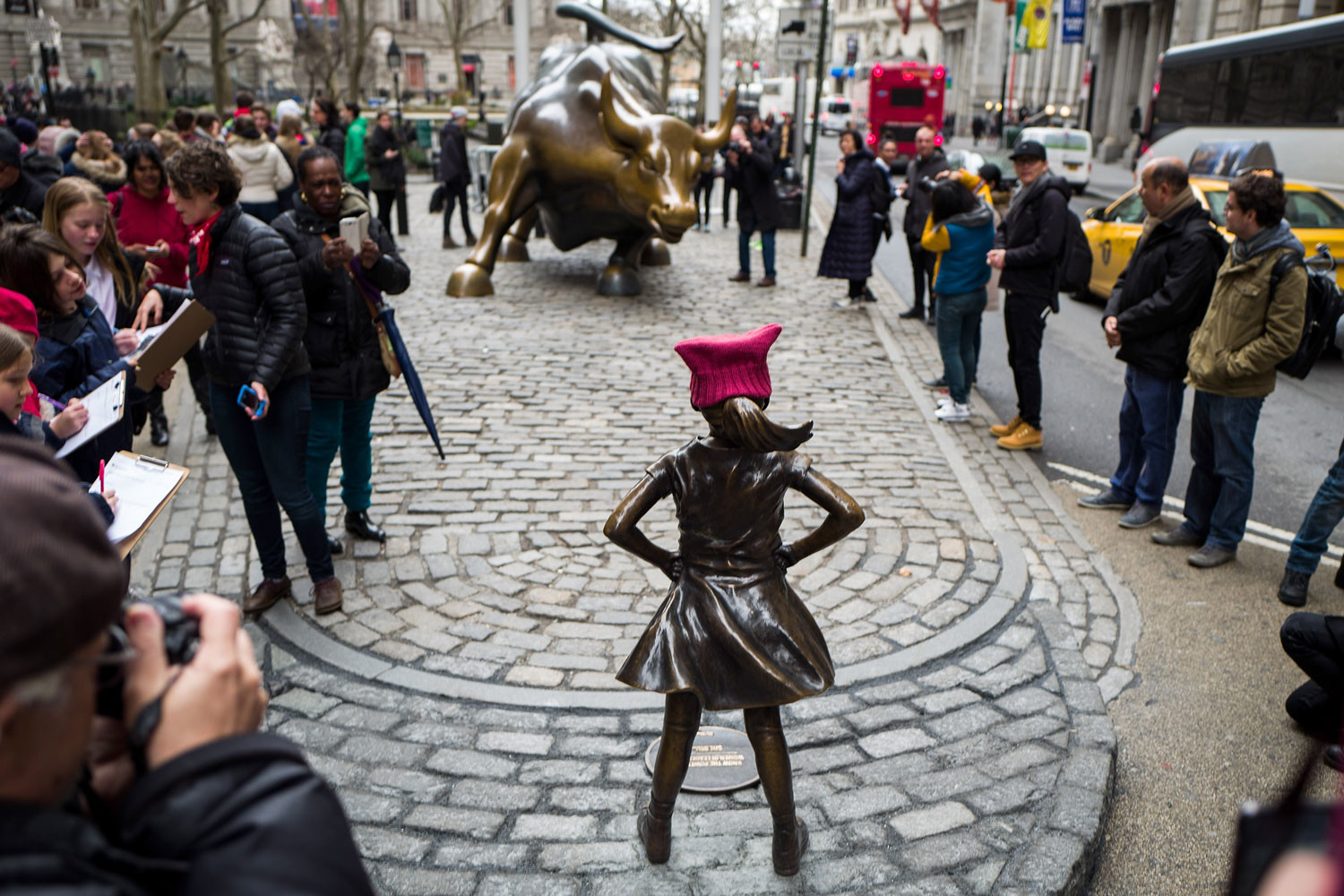 Бронзовую статую разместили напротив знаменитого атакующего быка, символизирующего агрессивный финансовый рынок. Ребенок бесстрашно смотрит в глаза животному, словно заявляя, что женщинам есть место и в финансовой сфере, где до сих пор большинство руководящих постов занимают мужчины.