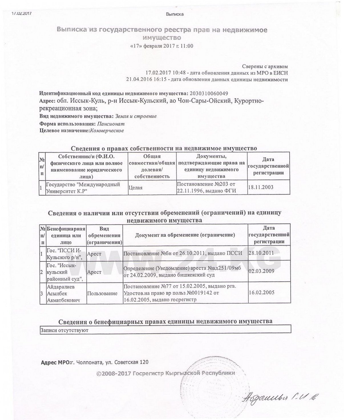 Тогда появилась идея передать объект Министерству юстиции. Однако суд вынес решение в пользу МУКа. В правительстве признают, что Межрайонный суд Иссык-Кульской области удовлетворил иск университета о передаче пансионата.