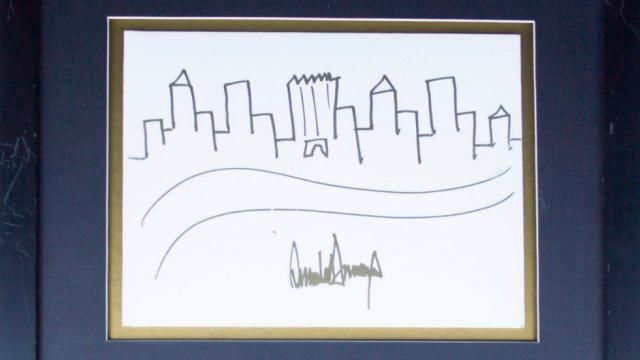 Набросок, на котором изображены очертания домов Нью-Йорка с небоскребом Trump Tower в центре, сделан черным маркером и обрамлен золотой рамкой. Под рисунком стоит автограф Трампа.
