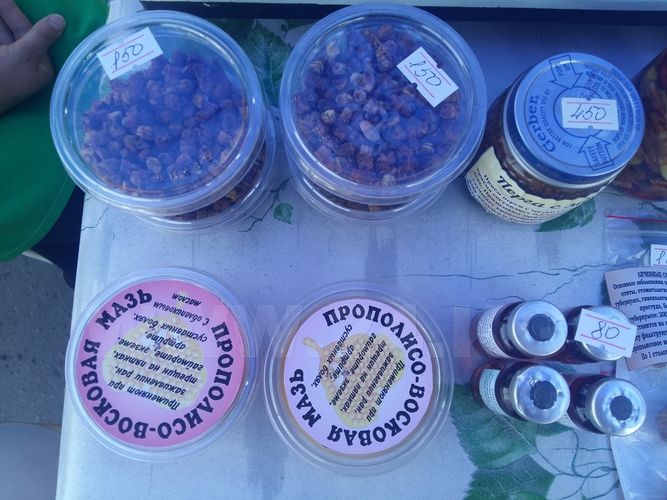 Но купить на ярмарке можно не только мед. Пчеловоды приготовили богатый ассортимент пчелиной продукции: пыльцу, пергу, воск и свечи из него, соты и маточное молочко.