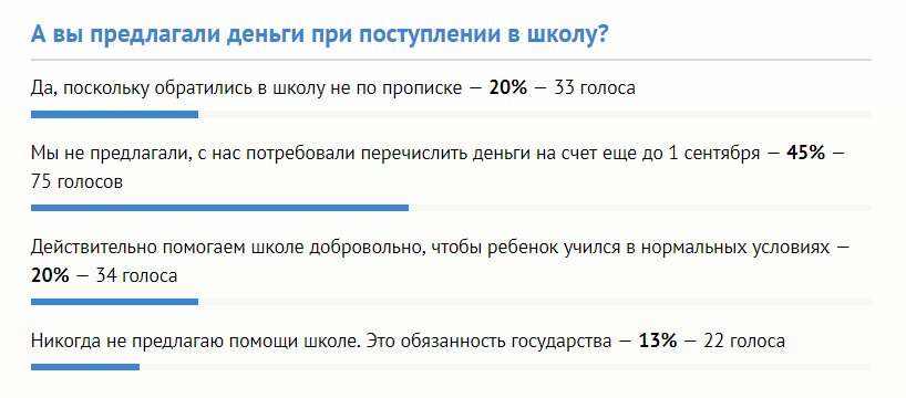 20 процентов признались в том, что были вынуждены предложить деньги, поскольку обратились в школу не по прописке. Еще столько же помогают школе действительно добровольно, чтобы ребенок учился в нормальных условиях.