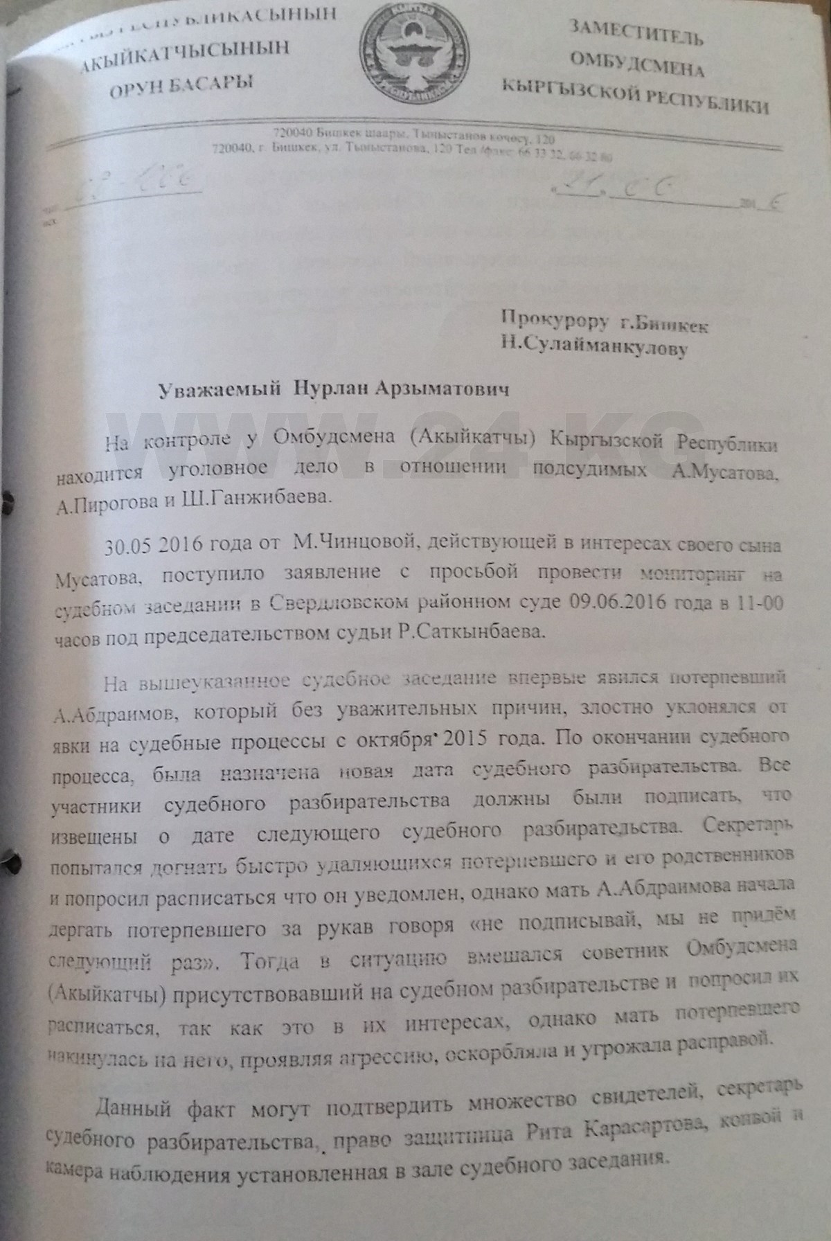 Дело «о похищении» доблестные правоохранители возбудили только на основании заявления должника Аската Абдраимова от 23 июля, не удосужившись даже произвести выемку камер видеонаблюдения с «места похищения».