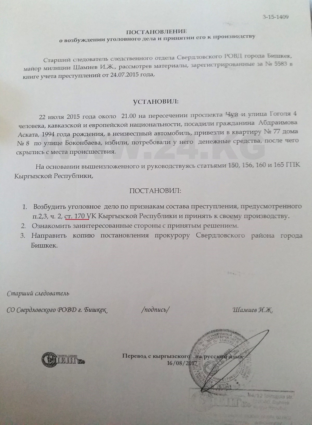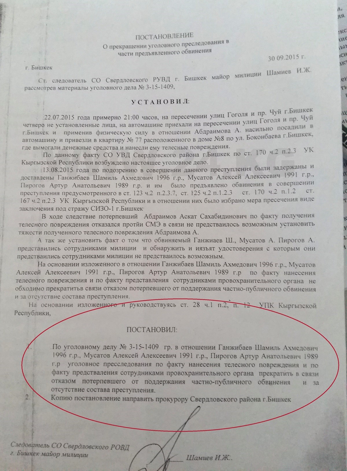 Задержали Пирогова, Мусатова, Гаджибаева только 12 августа 2015 года, в разных местах, а в протоколе указали статью 170 УК КР «Вымогательство». Позже, непонятно почему, добавились статьи «Похищение человека», «Лишение свободы» и «Грабеж».