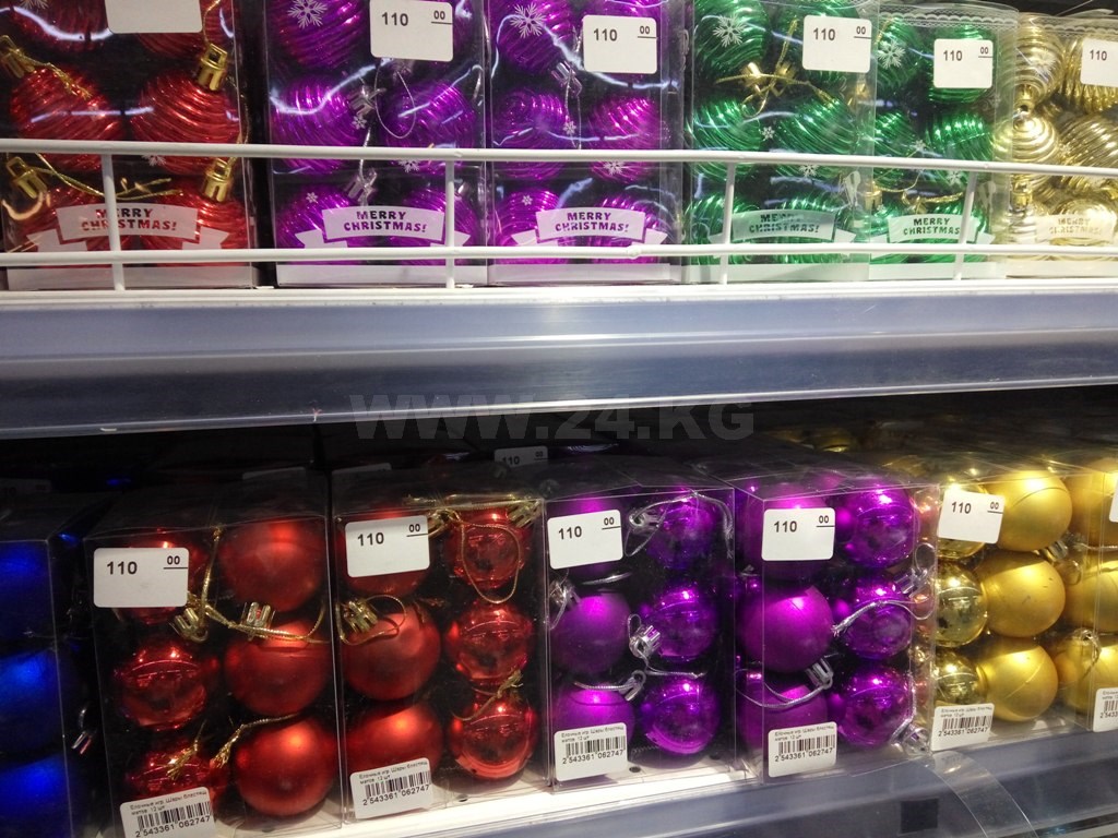 А вот цены на игрушки практически такие же, как на базаре. Упаковка из 12 шаров стоит 110 сомов. Игрушки, оформленные блестками, гораздо дороже — от 300 сомов.