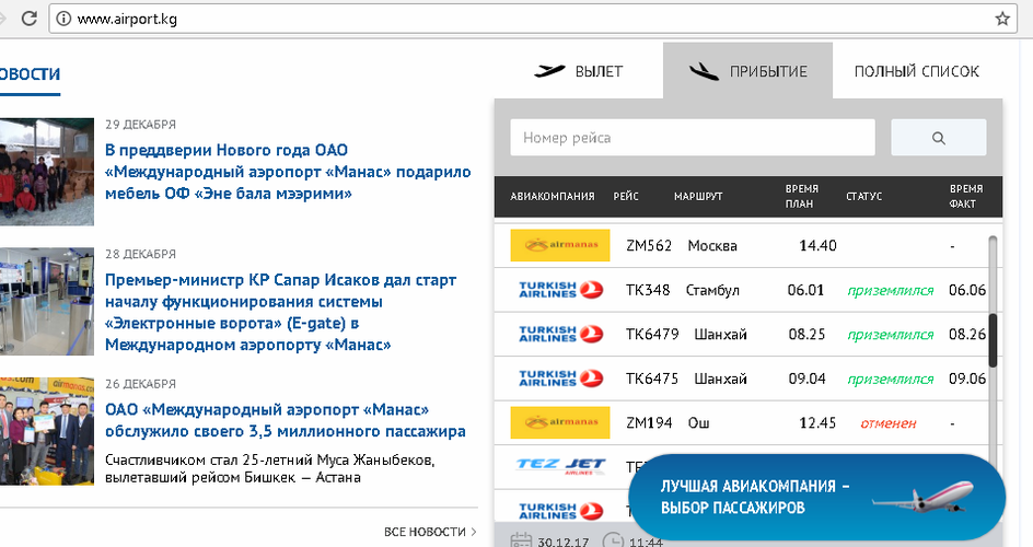 Согласно данным аэропорта «Манас», рейс ZM 194 из Оша авиакомпании «Айр Манас», прибытие которого ожидалось в 12.45, отменен.