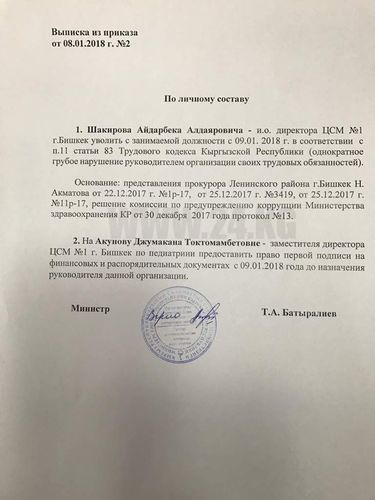 «Есть неоднократные нарушения. Кроме того, руководство не может создать нормальную психологическую атмосферу в коллективе. Было три представления прокуратуры в декабре 2017 года. Мы организовали комиссию, которая их рассмотрела, 5 января мне представили решение — рассмотреть Айдарбека Шакирова на соответствие занимаемой должности. С сегодняшнего дня он уволен с занимаемой должности», — сказал Талантбек Батыралиев.