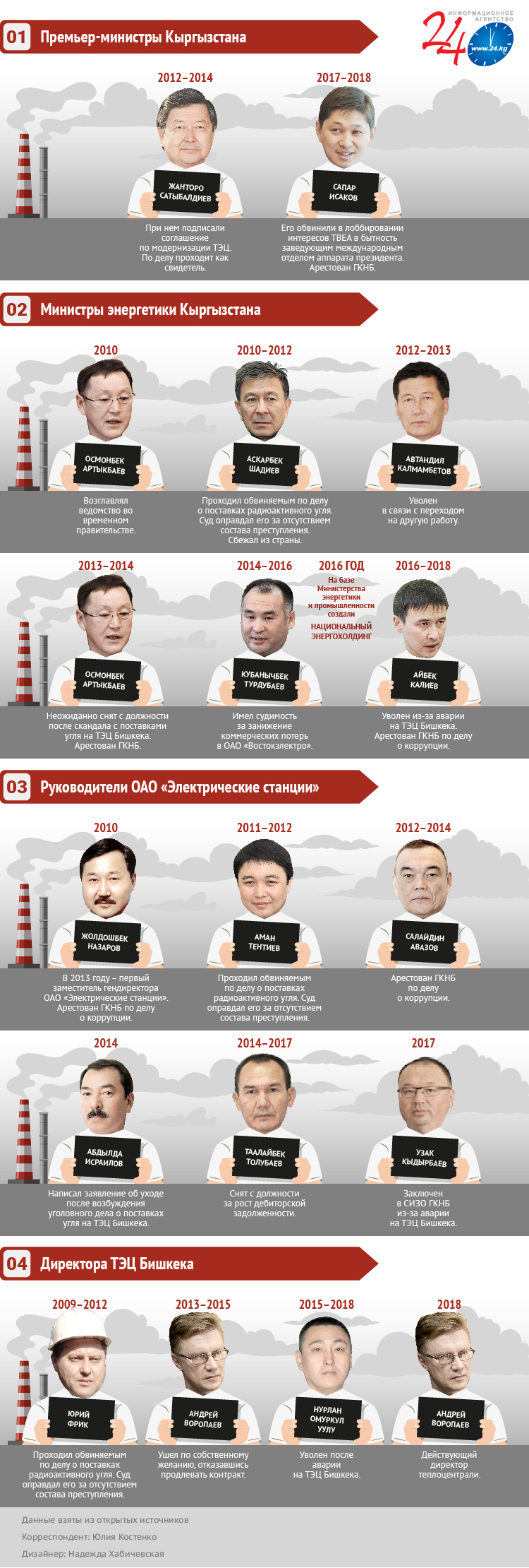 Из-за аварии на ТЭЦ Бишкека продолжают задерживать и допрашивать энергетиков, бывших высокопоставленных чиновников и депутатов Жогорку Кенеша. Следствие не ограничивается только аварией. Оно напрямую связывает дело с модернизацией теплоцентрали китайской компанией ТВЕА. Возбуждено четыре уголовных дела.