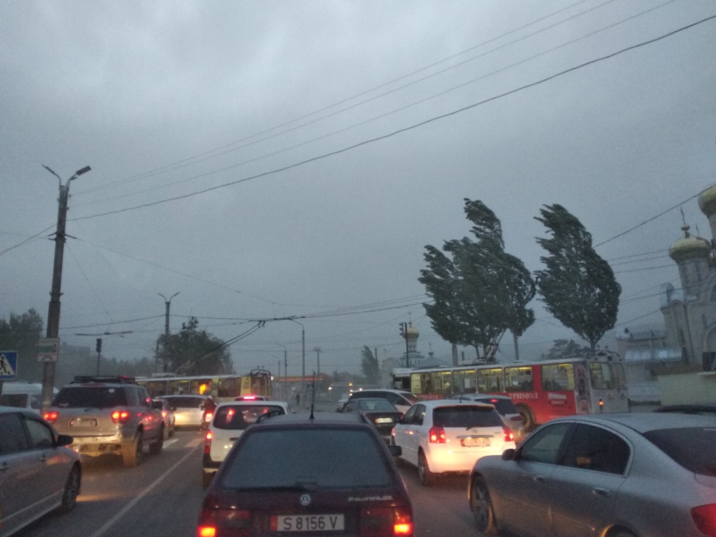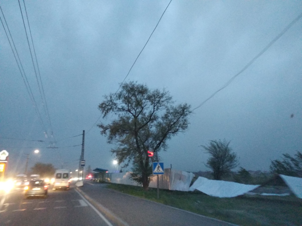 Ветер бушует почти час. В городе не работают некоторые светофоры, с билбордов сорвало рекламные плакаты, местами выломало заборы. Некоторые дома в микрорайоне «Аламедин-1» и селе Лебединовке остались без света.