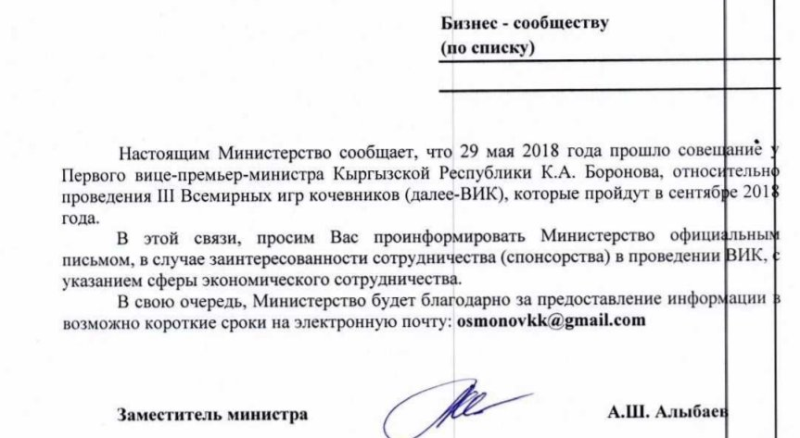 В письме указывается, что 29 мая 2018 года под председательством первого вице-премьер-министра Кубатбека Боронова прошло совещание по вопросу подготовки к Играм. В связи с этим Минэкономики просит бизнес проинформировать о заинтересованности в сотрудничестве. В том числе речь идет и о спонсорстве. Письмо подписано заместителем министра экономики Автандилом Алыбаевым.