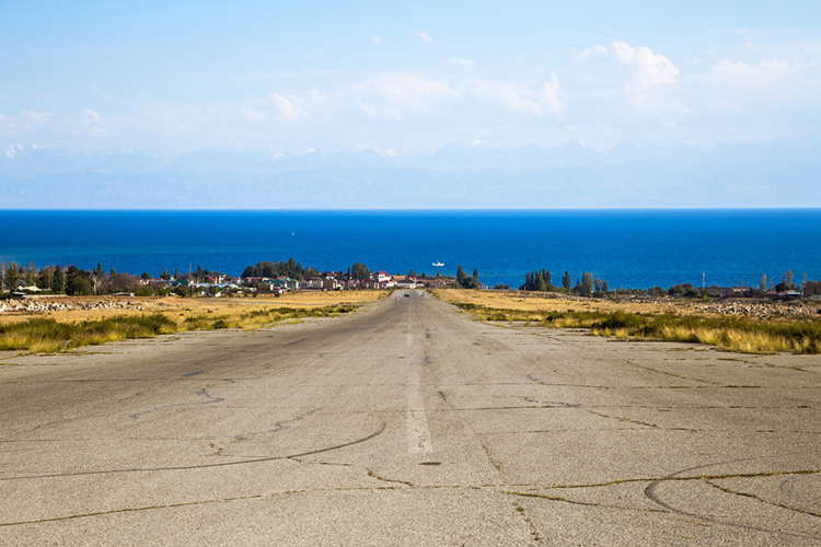 Аэропорта в Чолпон-Ате нет. От старого аэропорта осталась только взлетная полоса, с которой открывается прекрасный вид на озеро.