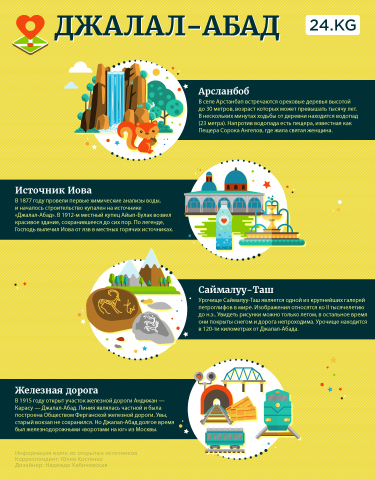 Великий Шелковый путь проходил через Джалал-Абад, который гостеприимно принимал путешественников в течение многих столетий. Об этом свидетельствуют археологические раскопки, проведенные в Чаткальской долине. А еще Джалал-Абад знаменит курортами и минеральными источниками.