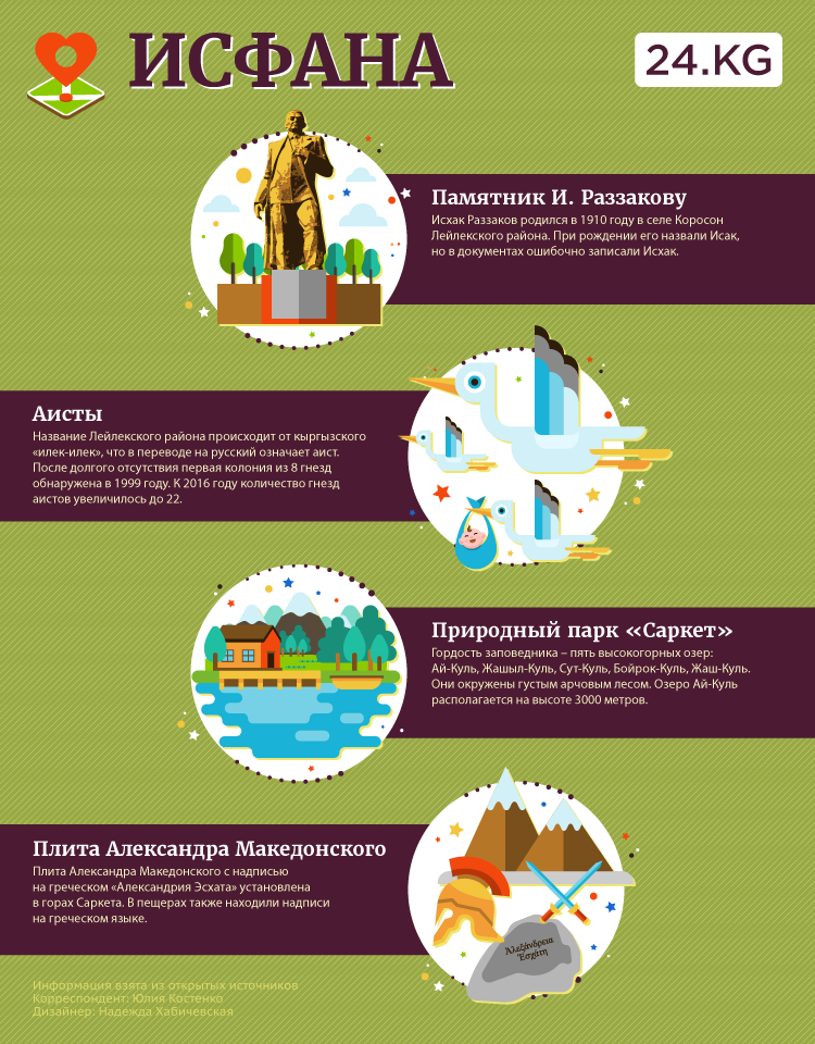 В Исфане три музея – исторический, Исхака Раззакова и Славы. Многие экспонаты и документы из музея Исхака Раззакова перевезли в Бишкек в его дом-музей на улице Чуйкова.