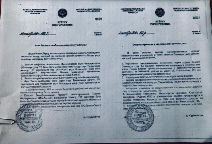 «Когда мы узнали, что раньше здесь был садик, то мэр Бишкека сразу сказал, что никакого бизнес-центра на этой территории не будет. Это было его личное решение — построить детский сад на этом участке. Мэр решил восстановить историческую справедливость. Распоряжение уже подписано. Теперь Управление капитального строительства начнет проектировать детский сад», — подчеркнула Гуля Алмамбетова.