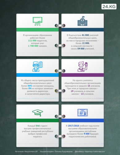 По его данным, в 2017 году на долю занятых в сфере образования республики приходилось около 9 процентов трудоспособного населения. В Кыргызстане работает около 4 тысяч организаций дошкольного, общеобразовательного, начального, среднего и высшего профессионального образования.