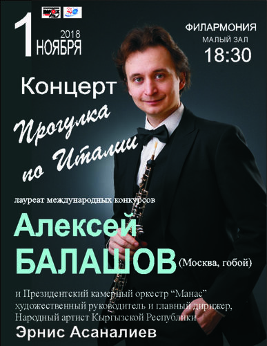 В нем примут участие лауреат международных конкурсов Алексей Балашов (Москва, гобой) и Президентский камерный оркестр «Манас» под управлением его основоположника, художественного руководителя и главного дирижера, народного артиста КР, лауреата международных конкурсов, доцента Кыргызской национальной консерватории Эрниса Асаналиева.
