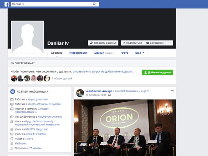 Заместитель министра внутренних дел КР Курсан Асанов, похоже, следит за социальными сетями под прикрытием. Его номер телефона привязан к аккаунту Санжарбека Моминова. На странице в Facebook размещена только одна фотография молодого человека.