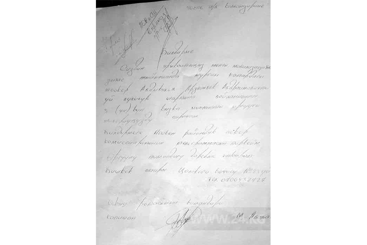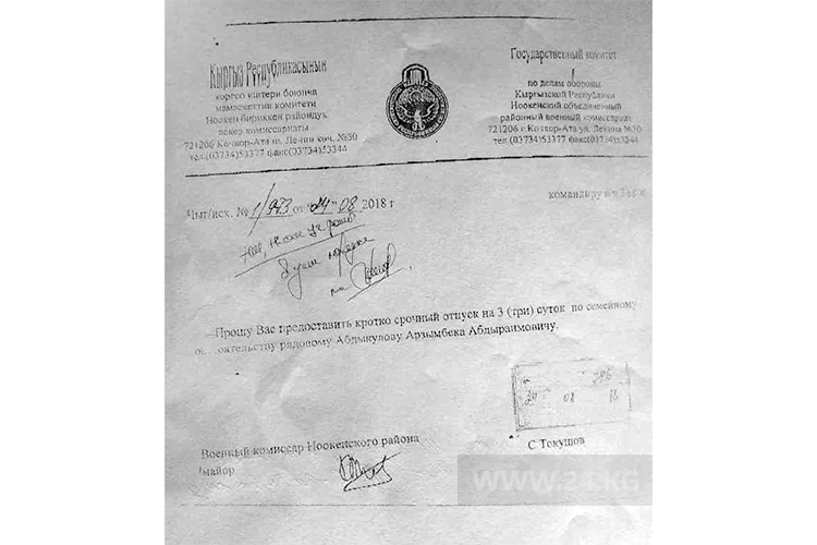 В документах, представленных юристом, указывается, что отпуск Арзымбеку Абдыкулову просил предоставить военный комиссар Ноокенского района С.Токушев. В телеграмме военком объяснил прошение семейными обстоятельствами рядового. Однако в рапорте командира роты М.Абабакирова указано, что Арзымбек Абдыкулов намерен проводить отпуск в Бишкеке, на улице Циолковского. Два документа противоречат друг другу.