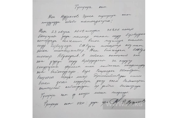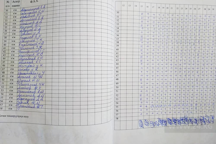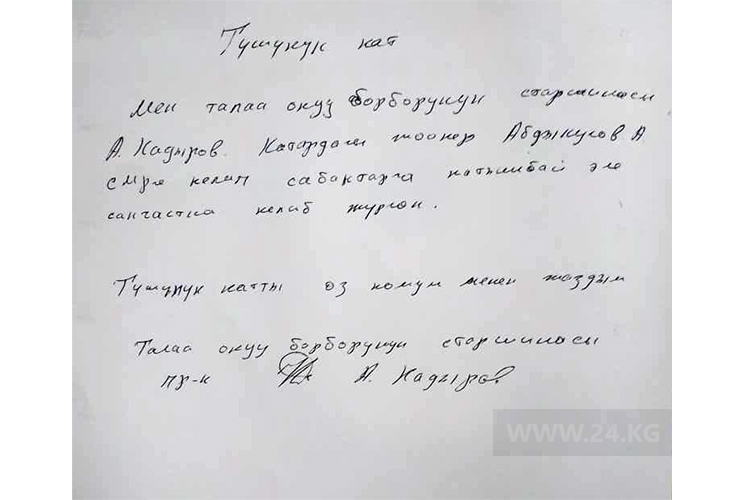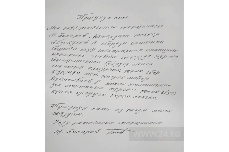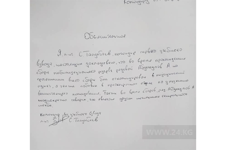 В объяснительных военнослужащих войсковой части 36806 указано, что Арзымбек Абдыкулов не посещал занятия во время сбора мобилизационного резерва. Кроме того, мужчина угрожал тем, что генерал Райимберди Дуйшенбиев за 6 секунд уволит с должности заместителя командра части по боевой подготовке майора Мунарбека Шакенова.