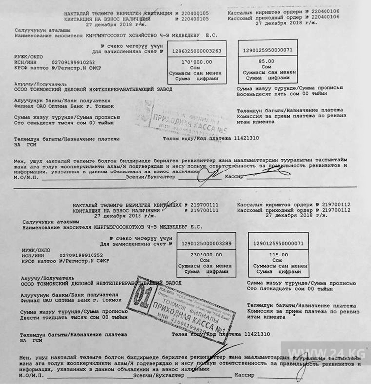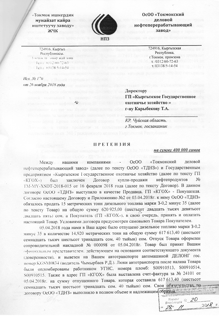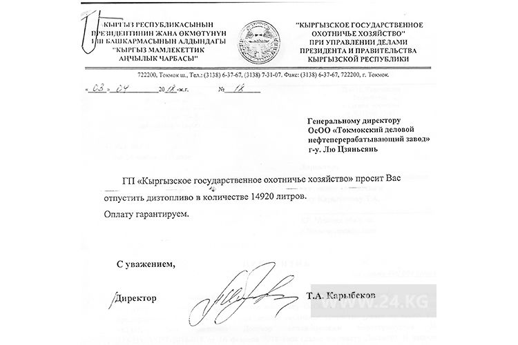 В феврале 2018-го Алтымыш Ибраимов обращается к директору Токмакского нефтеперерабатывающего завода Лю Цзяньсяну с просьбой поставить 14 тысяч 920 литров дизтоплива для нужд КГОХ на сумму 620 тысяч сомов. Оплатить заказанное количество Алтымыш Ибраимов гарантирует в срок. С поставщиком заключают соответствующий договор.