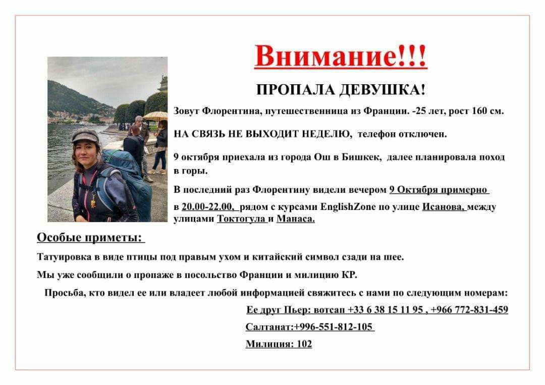 В Бишкеке пропала путешественница из Франции, 25-летняя Флорентина. Сообщение об этом распространяют в социальных сетях.