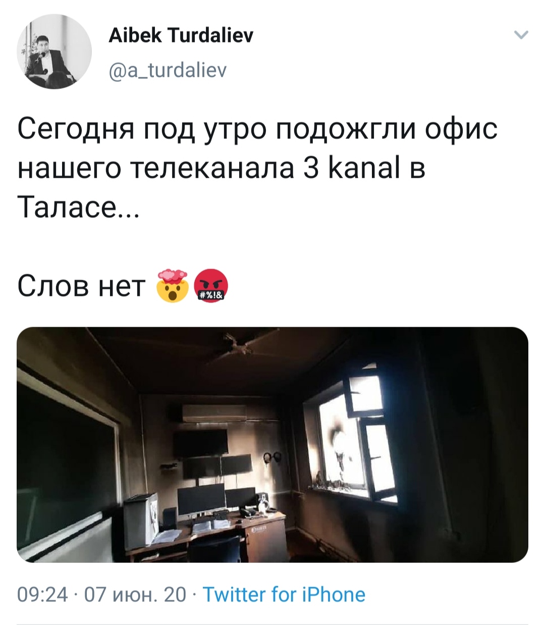 В Таласе в офисе «Третьего канала» произошел пожар. Об этом в Twitter сообщил журналист Айбек Турдалиев.