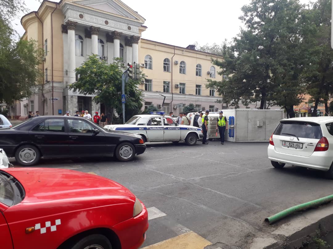 Фото мэрии Бишкека. На пересечении проспекта Чуй и улицы Тыныстанова перевернулась машина скорой помощи