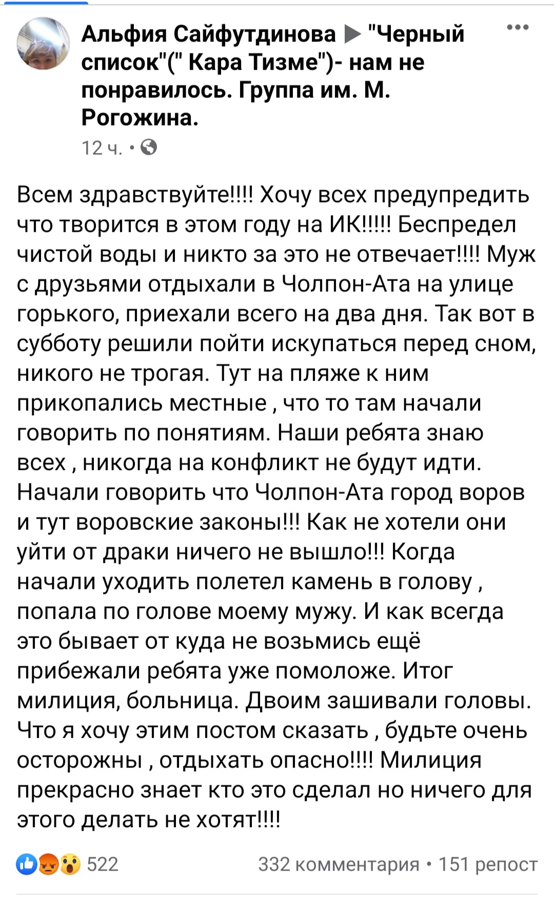 В городе Чолпон-Ате местные жители напали на отдыхающих. Об этом в группе «Черный список» — нам не понравилось» в Facebook написала пользователь Альфия Сайфутдинова.