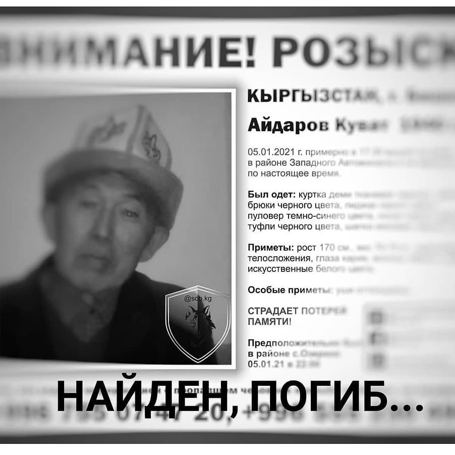 Пропавший 5 января 75-летний житель Бишкека Куват Айдаров найден мертвым. Информацию об этом 24-kg.com подтвердила координатор добровольного отряда спасателей Катерина Клевакова.