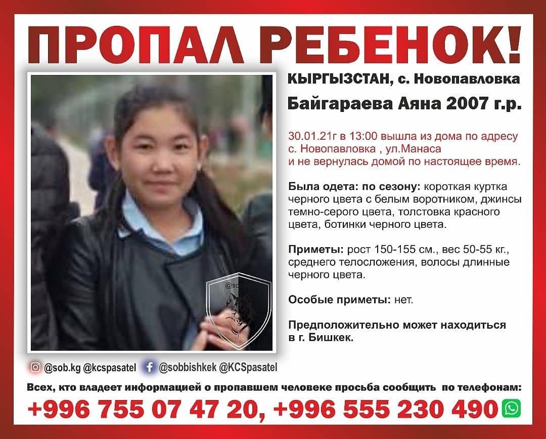 Тех, кто владеет информацией о местонахождении Аяны Байгараевой, просят сообщить по телефонам: 0755074720, 0555230490.