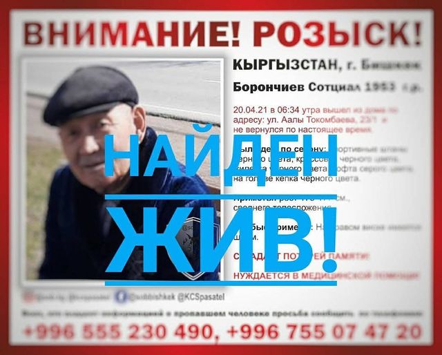 В Бишкеке найден без вести пропавший 68-летний Сотциал Борончиев. Об этом 24-kg.com сообщила координатор Добровольного отряда спасателей Катерина Клевакова.