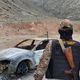 Возле водозабора «Головной» в Баткенской области до сих пор стоит сгоревший автомобиль. Местность охраняют сотрудники отдела специального назначения «Шер» Внутренних войск МВД.