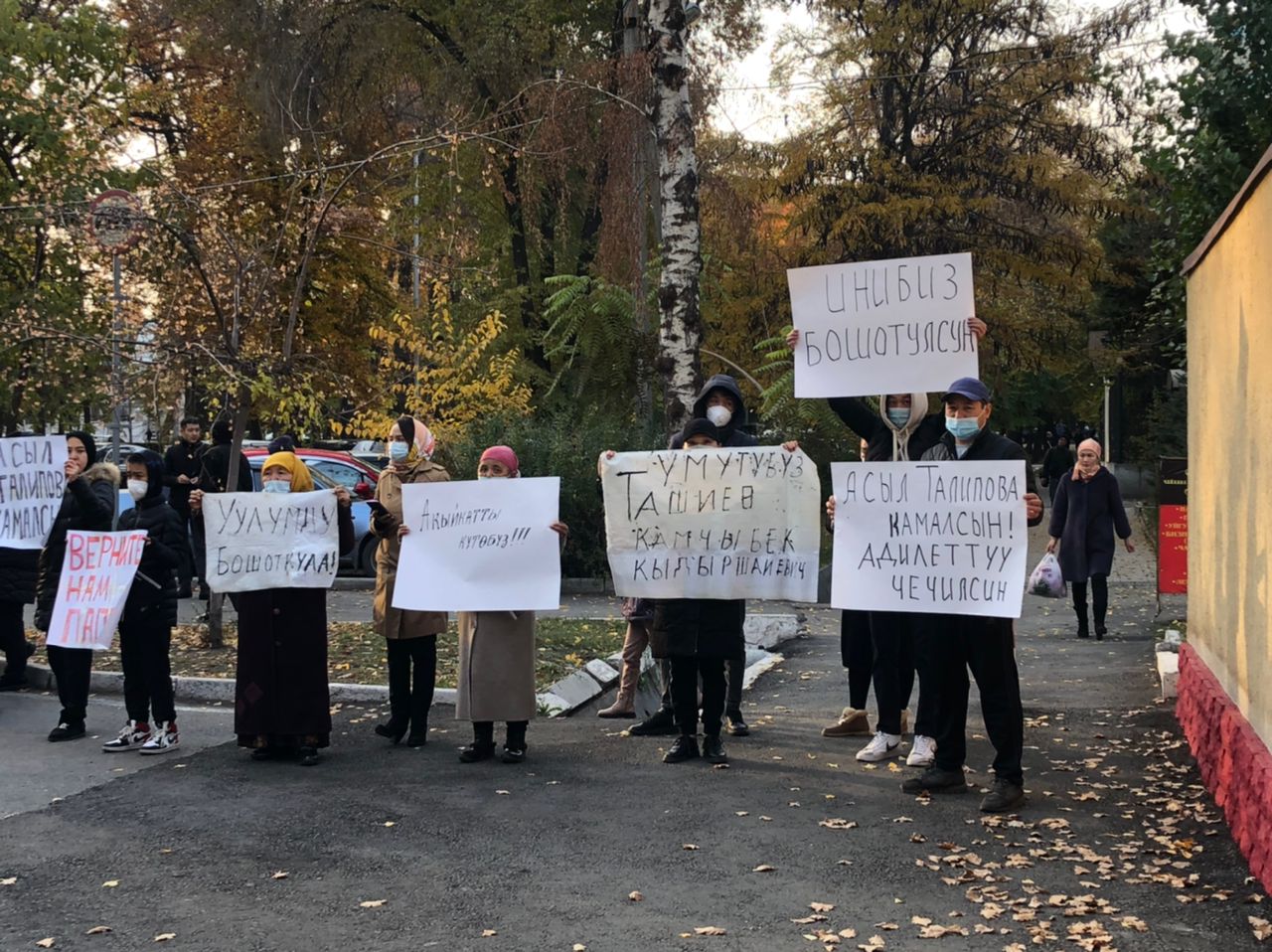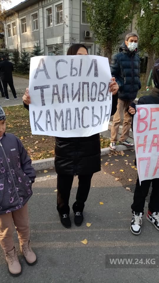 Около 20 человек требуют задержать ее. На плакатах акции протеста написано «Асыл Талипову задержать», «Надежда на Камчыбека Ташиева». По данным митингующих, женщина обманула 25 человек на сумму $344 тысячи.