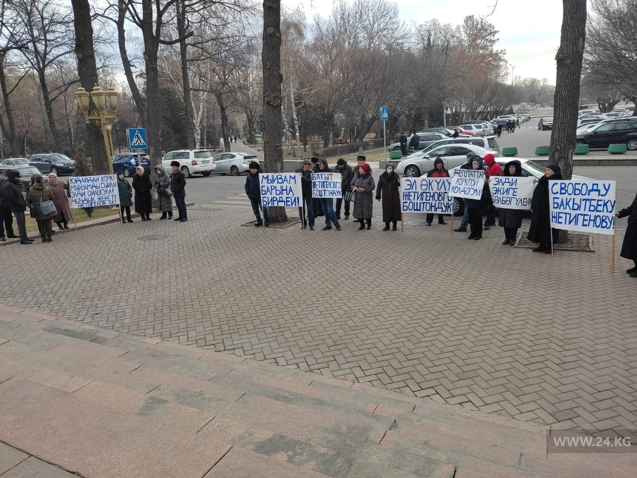 Около 20 сторонников нардепа, обвиняемого в попытке захвата власти, требуют отпустить его. По мнению участников акции протеста, Бакыта Жетигенова безосновательно обвинили в тяжком преступлении.