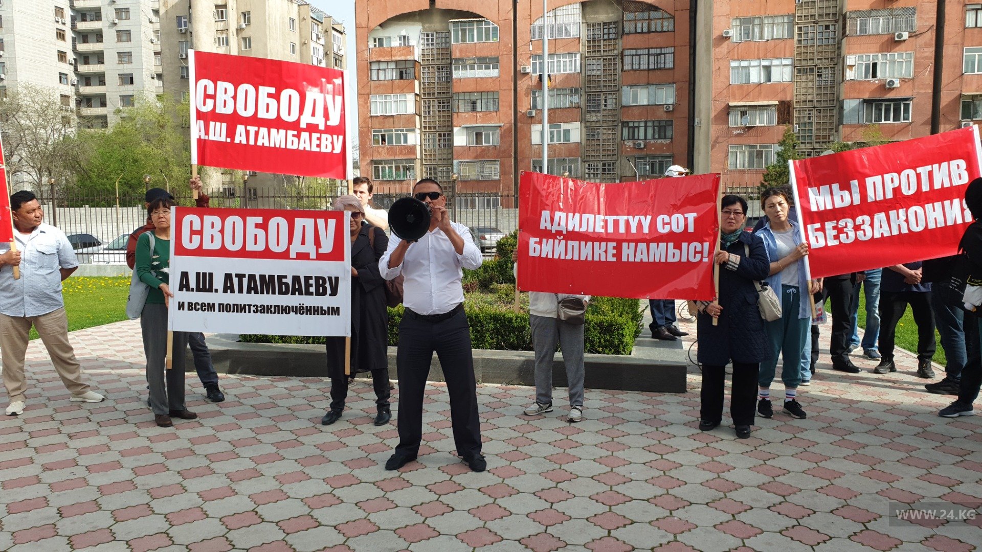 К зданию суда пришли около 20 сторонников бывшего президента Алмазбека Атамбаева. Они требуют освободить его.