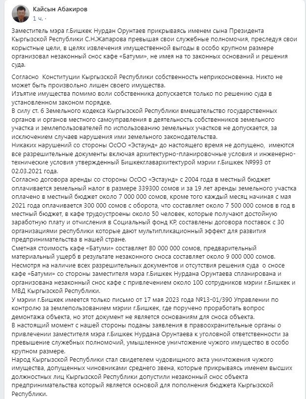 Вице-мэр Бишкека Нурдан Орунтаев, прикрываясь именем сына президента Садыра Жапарова для извлечения имущественной выгоды в особо крупном размере, организовал незаконный снос кафе «Батуми». Об этом на своей странице в Facebook написал адвокат Кайсын Абакиров.