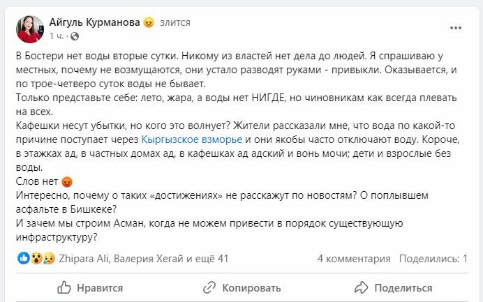«Я спрашиваю у местных, почему не возмущаются. Они устало разводят руками — привыкли. Оказывается, и по трое-четверо суток воды не бывает. Только представьте себе: лето, жара, а воды нет нигде, но чиновникам, как всегда, плевать на всех. Кафешки несут убытки, но кого это волнует? Жители рассказали мне, что вода по какой-то причине поступает через пансионат «Кыргызское взморье», и они якобы часто отключают воду. Короче, в этажках ад, в частных домах ад, в кафешках ад адский и вонь мочи. Дети и взрослые без воды», — написала Айгуль Курманова.