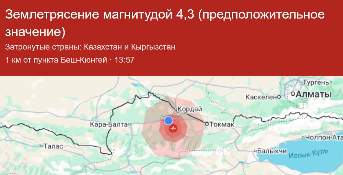 Возле Бишкека в 13.57 произошло землетрясение. Эпицентр располагался в 1 километре от села Беш-Кунгей.