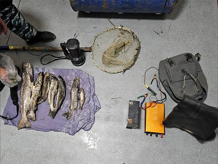При проверке у нарушителей были обнаружены: 7 штук форели, автомобильный аккумулятор, фонарик, электрический сачок, самодельное устройство для электрического лова рыбы.