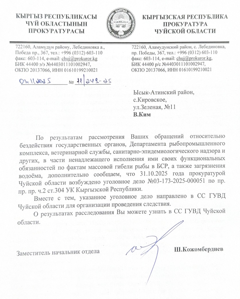 Владелец водоема просит руководство правоохранительных органов Чуйской области помочь ему в этом деле, обеспечить соблюдение требований УПК КР, признать его потерпевшим, ускорить следственные действия и защиту экологических прав граждан.
