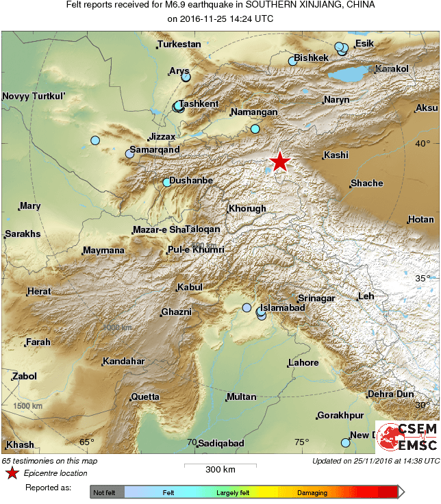 Сегодня в 20.24 неподалеку от китайско-кыргызской границы произошло землетрясение магнитудой 6.9. Об этом сообщает Европейско-Средиземноморский сейсмический центр (EMSC).