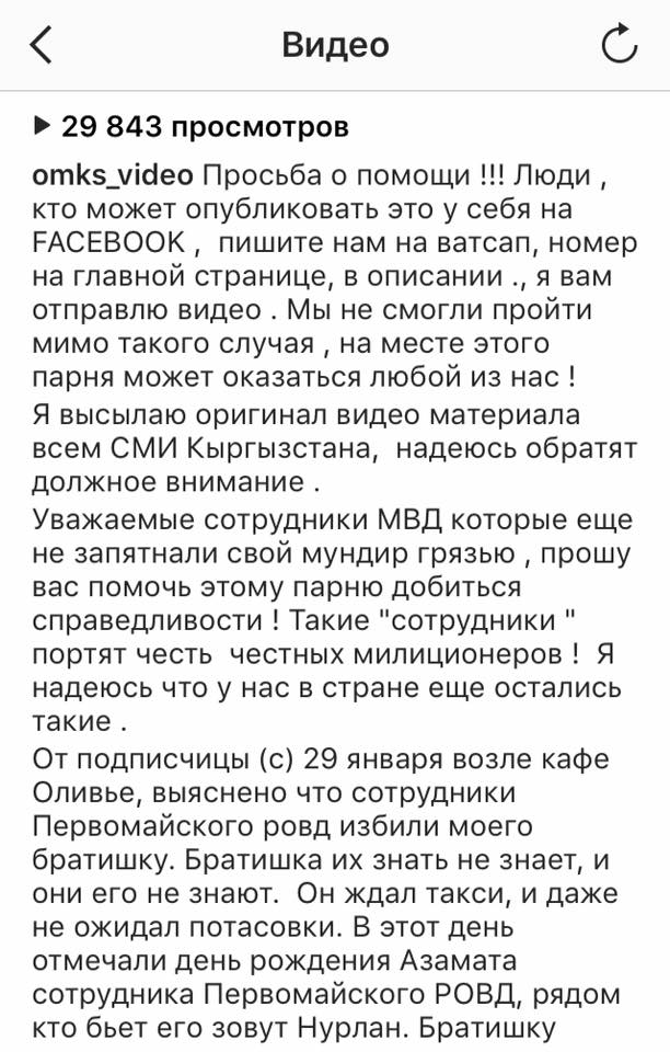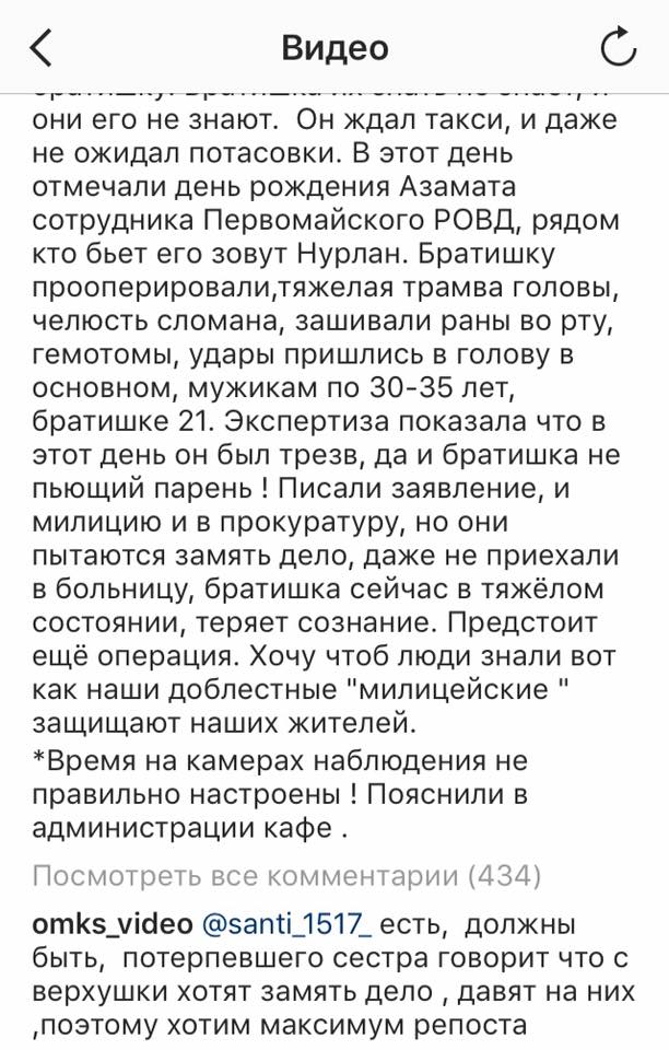 «29 января возле кафе «Оливье», выяснено, что сотрудники Первомайского РОВД избили моего братишку. Братишка их знать не знает, и они его не знают. Он ждал такси, и даже не ожидал потасовки. В этот день отмечали день рождения Азамата - сотрудника Первомайского РОВД, рядом кто бьет его, зовут Нурлан. Братишку прооперировали, тяжелая травма головы, челюсть сломана, зашивали раны во рту, гематомы, удары пришлись в голову в основном. Мужикам по 30-35 лет, братишке 21. Экспертиза показала, что в этот день он был трезв, да и братишка непьющий парень! Писали заявление, и милицию и в прокуратуру, но они пытаются замять дело, даже не приехали в больницу, братишка сейчас в тяжелом состоянии, теряет сознание. Предстоит еще операция. Хочу, чтоб люди знали вот как наши доблестные «милицейские» защищают наших жителей. Время на камерах наблюдения не правильно настроены! Пояснили в администрации кафе», - написано в комментариях к видео (орфография и пунктуация автора сохранены. - Прим. ИА «24.kg»).